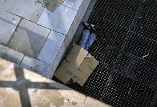 Ένας άστεγος άντρας κοιμάται επάνω σε έναν εξαερισμό, έξω από εναν κλειστά
